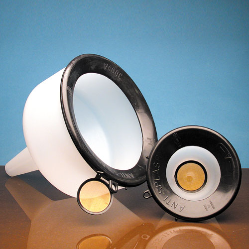 Anti-splash ring eliminates spilling of liquids caused by the swirling action created when a liquid is poured into a funnel. Supplied with an attached 100 mesh filter.