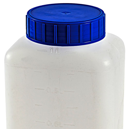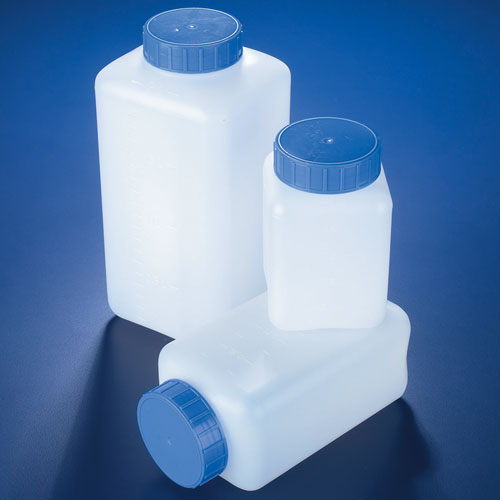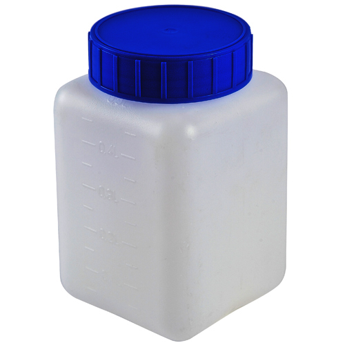 Lightweight graduated rectangular plastic bottles with plug seal blue screw caps. Closure and insert are made of HDPE. Feature molded in graduations for approximate volume measurements. Supplied capped in shrink-wrapped packs.