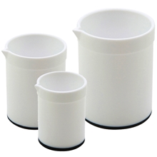 PTFE heatable beakers features the unique combination of a pure PTFE body with a specially formulated stabilized PTFE Carbon base as a single molding allowing for heating to 270°C without distortion.