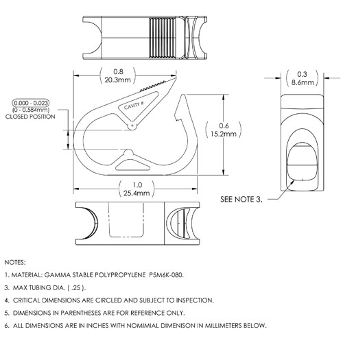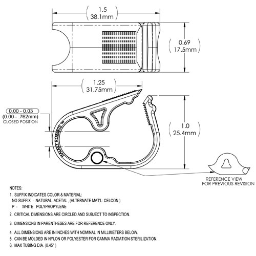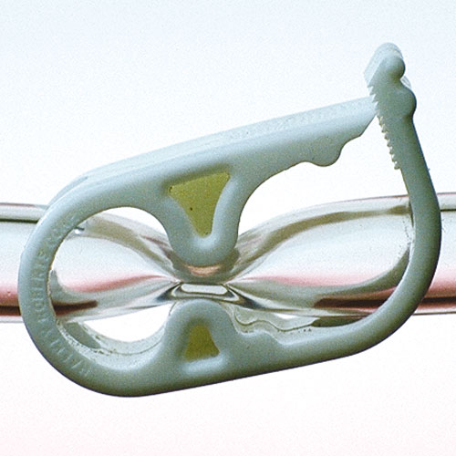 670715 Single Position Polypropylene Mini Clamps tubing clamps are designed for on/off control of fluid or air. Features One-hand control and are economically priced for disposable applications. Maximum tubing O.D. = 0.25 inch (6.3mm)