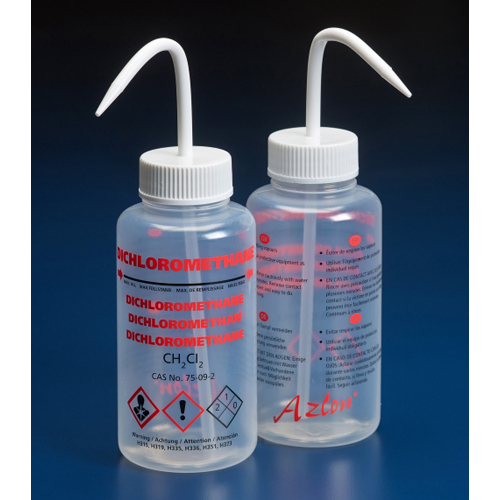 Multilingual wide neck Polypropylene plastic wash bottles printed with either Dichloromethane or Methyl ethyl ketone labels.