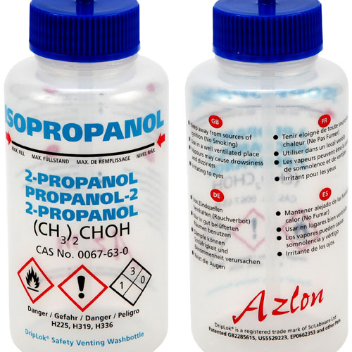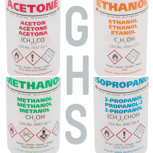 • Multilingual wide mouth GHS plastic wash bottles featuring the patented DripLok® vapor venting valve that prevents solvent drips