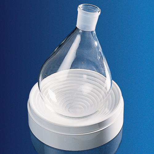 This autoclavable ribbed plastic flask stand safely supports round bottom flasks that contain up to 10 liters. The inner smallest ring is 30mm diameter 3mm depth.