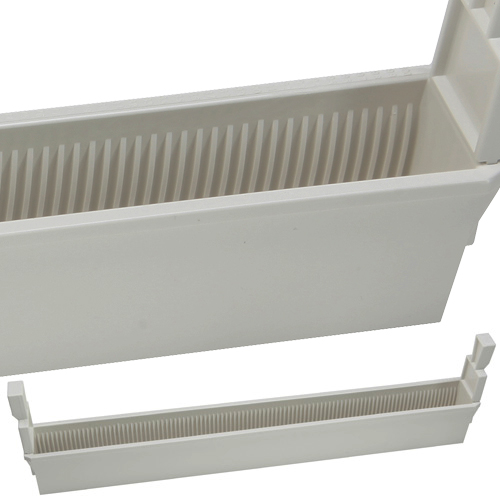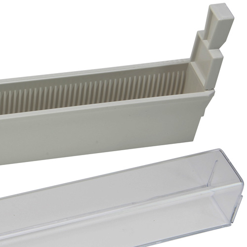Slide tray holds 100 standard 1” x 3” slides positioned vertically for easy insertion in pre-numbered grooves allowing for simple identification and retrieval.