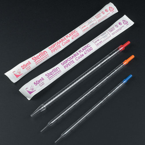 Crystal grade polystyrene is used for consistency in manufacture and maximum clarity, with easy to read crisp black printed graduations enabling the graduated pipettes to be used accurately to +/-1%. Sterility is guaranteed by gamma radiation at a license holding irradiation plant, which follows the relevant recommendations in the DHSS Guide to Good Manufacturing Practice for Sterile Medical Devices and Surgical Products. Sterilin graduated pipettes are tested for pyrogencity, and have a pyrogen level of less than 0.25 EU/ml.