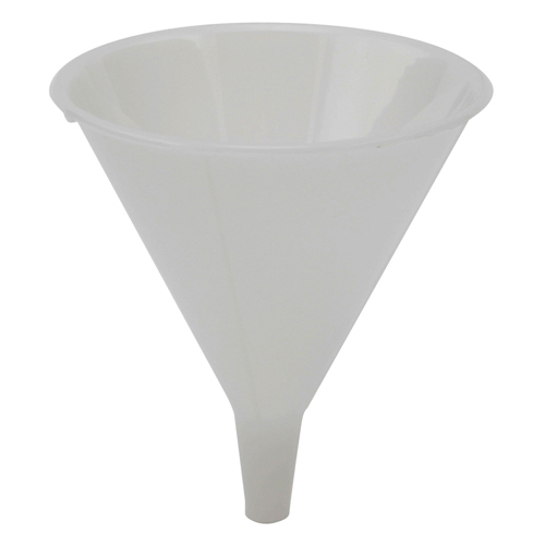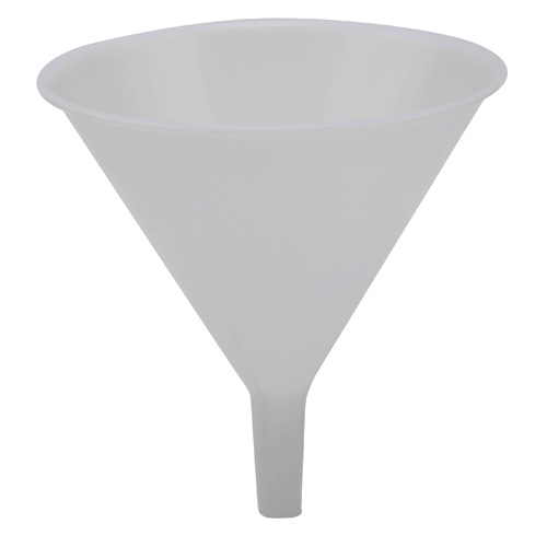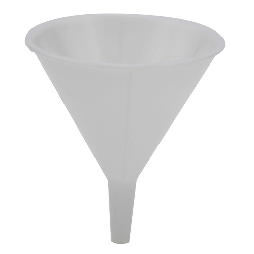 Plastic utility funnels are inexpensive, lightweight and designed for general use. They are made of polypropylene and high density polyethylene depending on the size.