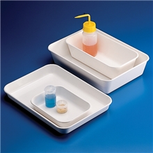 High impact plastic trays are useful for the transport and benchtop storage of vials, bottles, containers, instruments and various laboratory accessories.