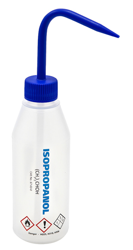 These stylish sloped shoulder wash bottles are available with seven different printed labels. All are fitted with color coded polypropylene swivel/leak proof closures featuring an acute angled “swan neck” dispensing spout.