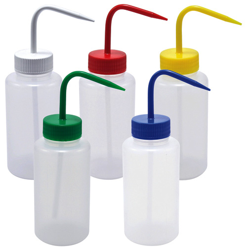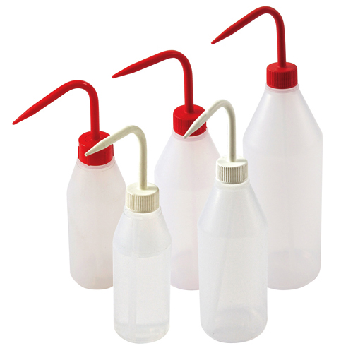 Plastic wash bottles are supplied in flexible natural polyethylene and are fitted with a range of color coded leak proof, wide neck polypropylene spout closures.