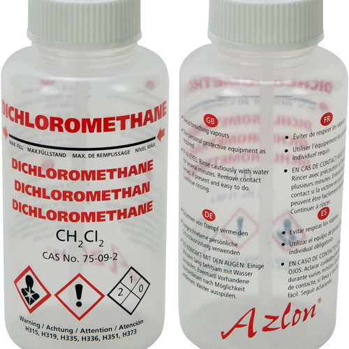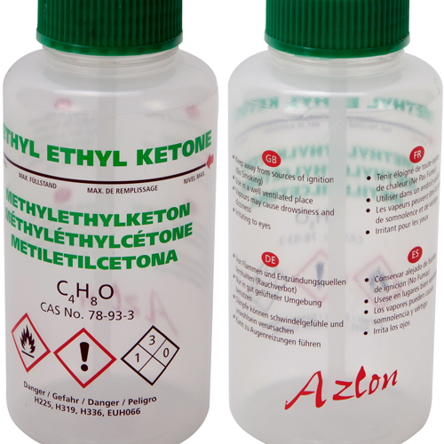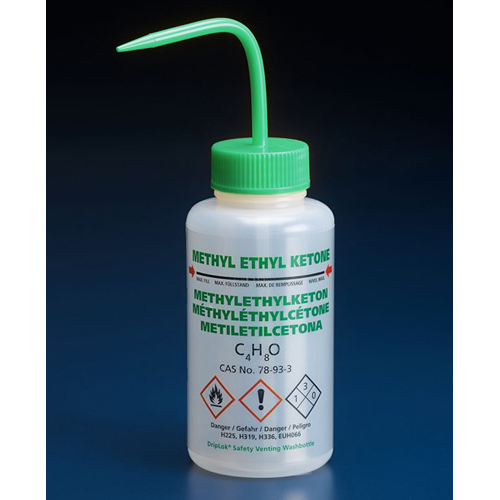 Multilingual wide neck Polypropylene plastic wash bottles printed with either Dichloromethane or Methyl ethyl ketone labels.