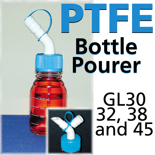 The unique design allows direct and controlled pouring due to the incorporated breather vent. The hazardous chemical bottle pourer comes in four sizes to fit standard reagent bottles with neck sizes of GL30, 32, 38 and 45. A captured PTFE closure prevents vapors from escaping and ensures contaminant free contents when not in use.