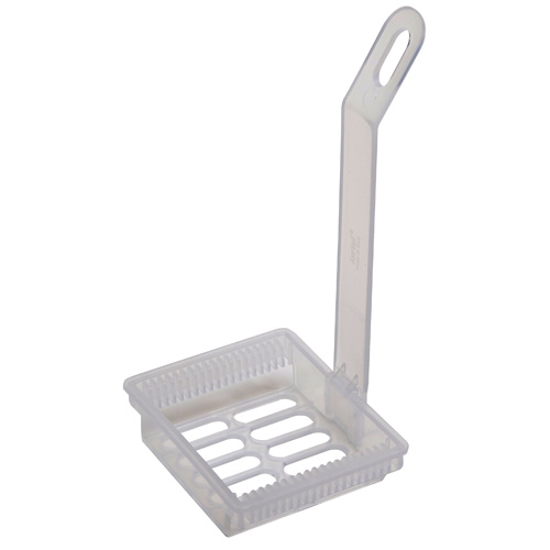 The staining tray (235405) has 20 grooves and holds 20 slides 3” x 1” (76 mm x 26 mm). Removable snap-on handle.