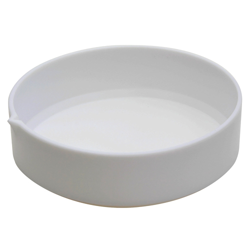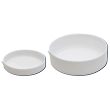 Low form evaporating dishes with pouring spout are manufactured from pure PTFE with heavy wall. Inert and useable to 260ºC. Smooth internal finish.
