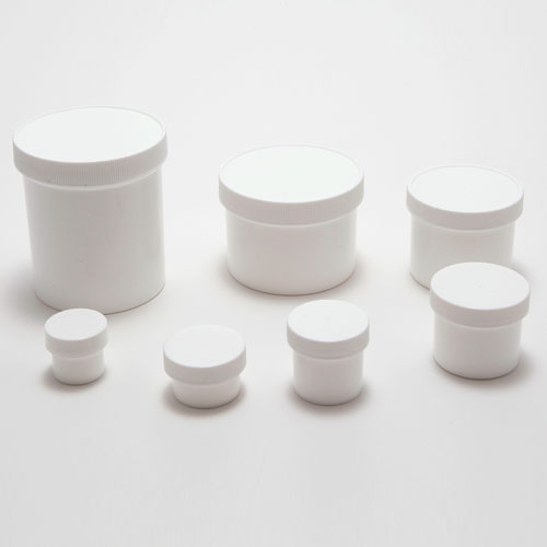 Plastic containers are molded of white opaque polypropylene, lightweight containers are not considered leak-proof. Many laboratory and industrial uses. Supplied with polypropylene screw closures. Maximum temperature PP is 121°C.