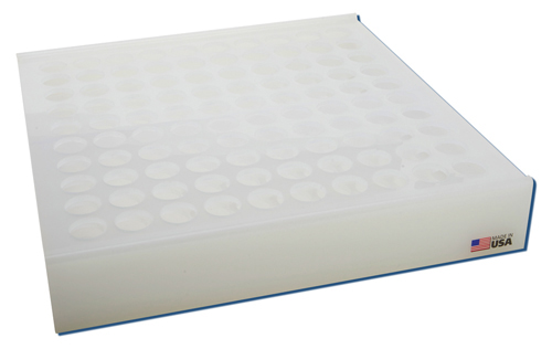 Scintillation Vial Rack is autoclavable and resists both nitric and hydrochloric acids. Hole diameter: 1 1/16”