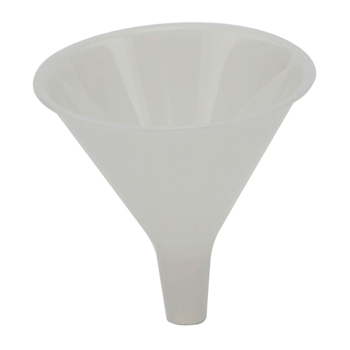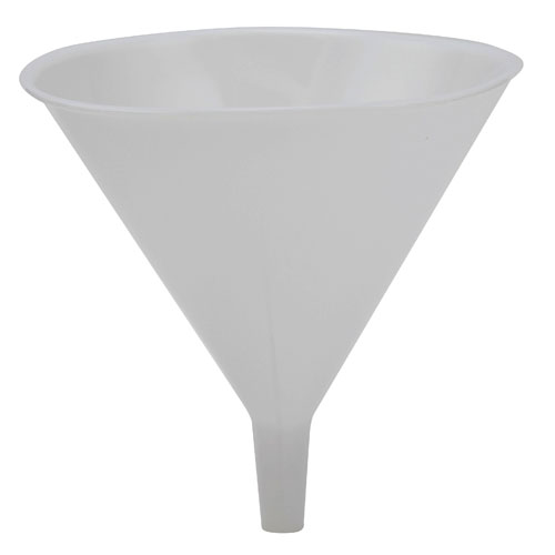 Plastic utility funnels are inexpensive, lightweight and designed for general use. They are made of polypropylene and high density polyethylene depending on the size.