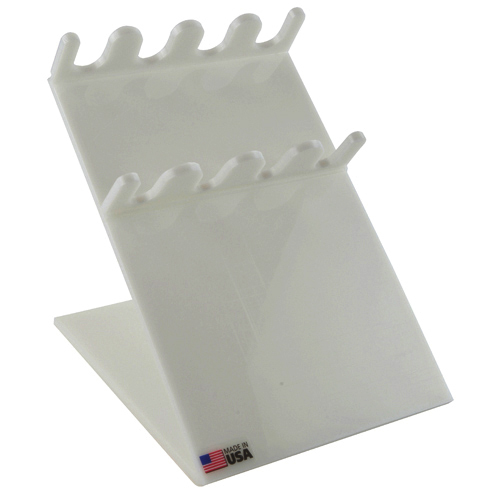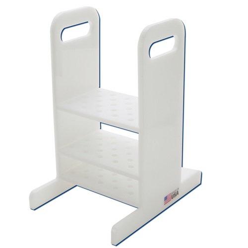 Thermometer rack is manufactured from 1/4” high density polyethylene, the rack is sturdy and will not tip. Sides have large comfortable carry handles for easy transport of the thermometers. Hole diameters in top and middle plates 5/16”. The bottom plate has convenient 1/8” drain holes.