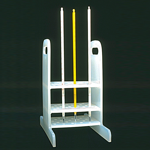 Thermometer rack is suitable for holding up to 25 thermometers in the correct vertical position, thus avoiding mercury separation, which may occur when thermometers are stored improperly.